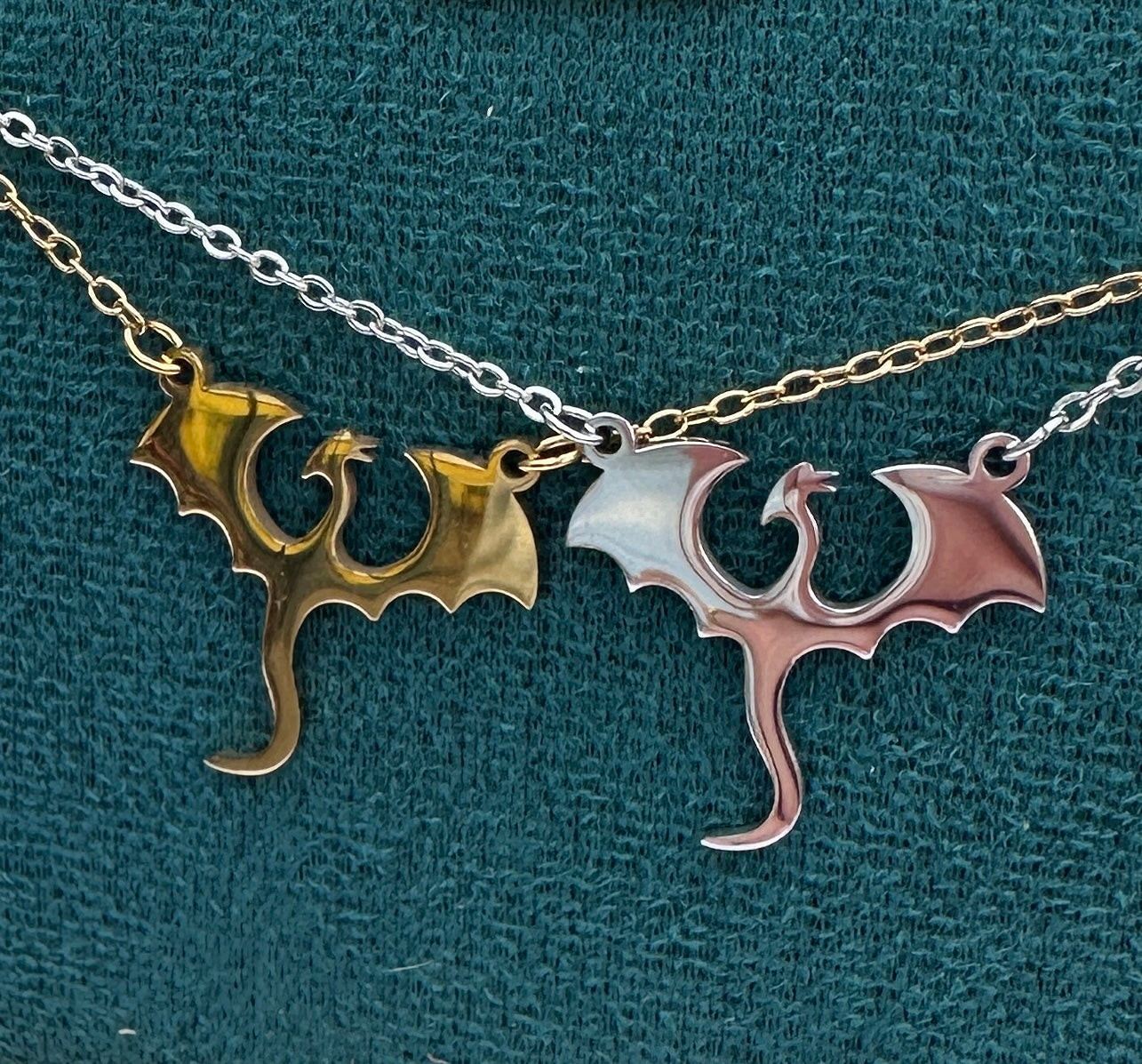 Tairn (silver) and Andarna (gold) dragon pendants