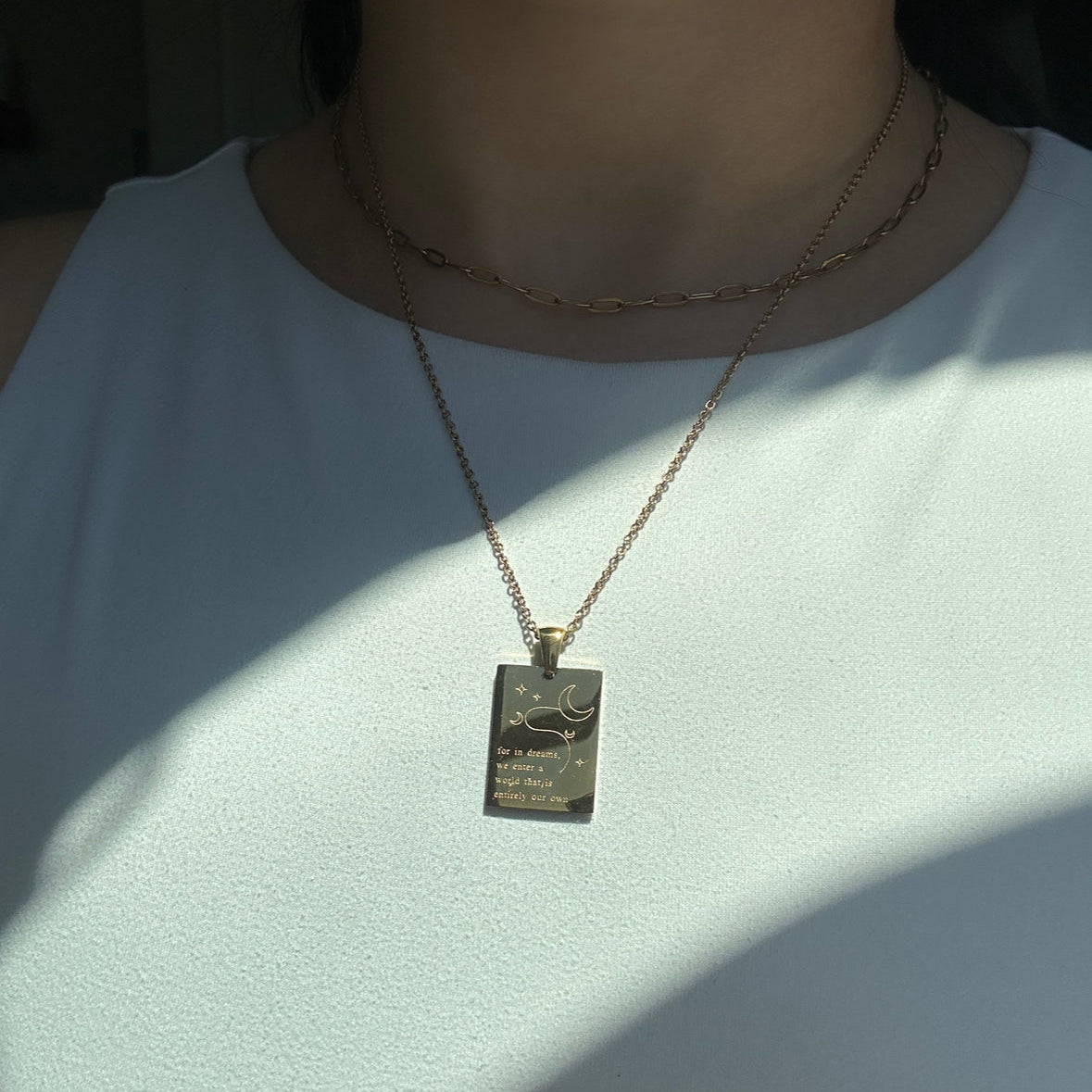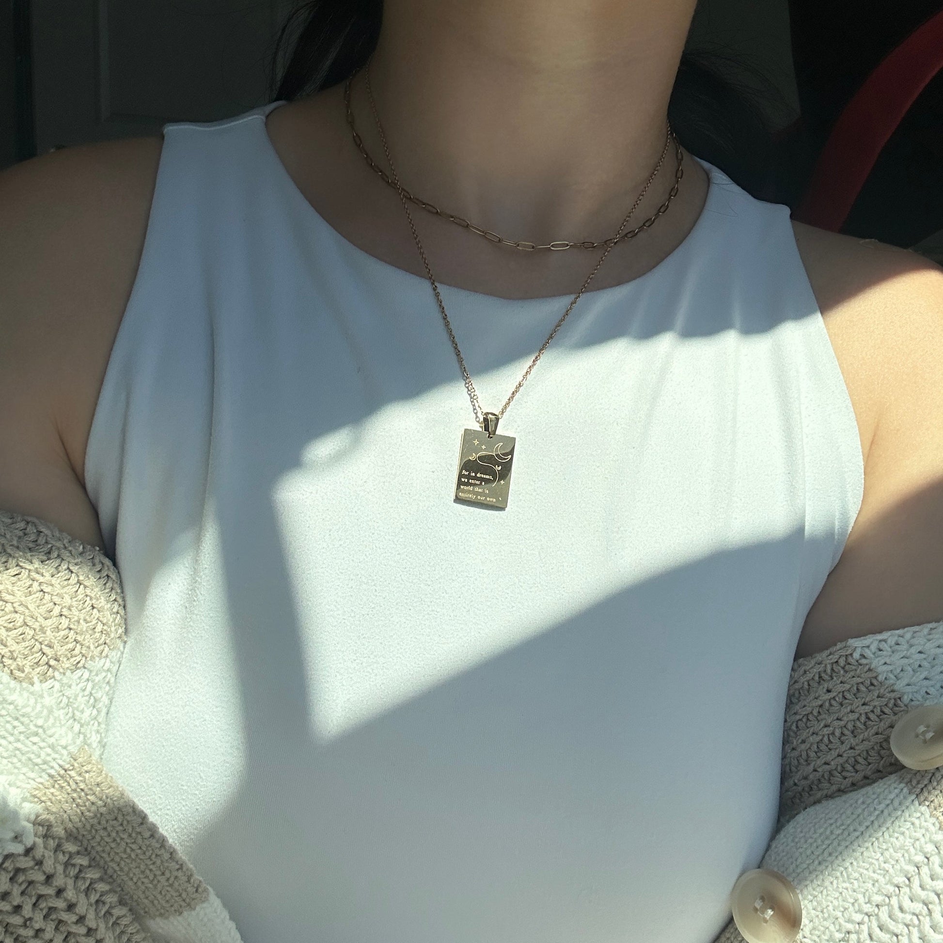Rectangular pendant necklace with "for in dreams, we enter a world that is entirely our own" engraving.
